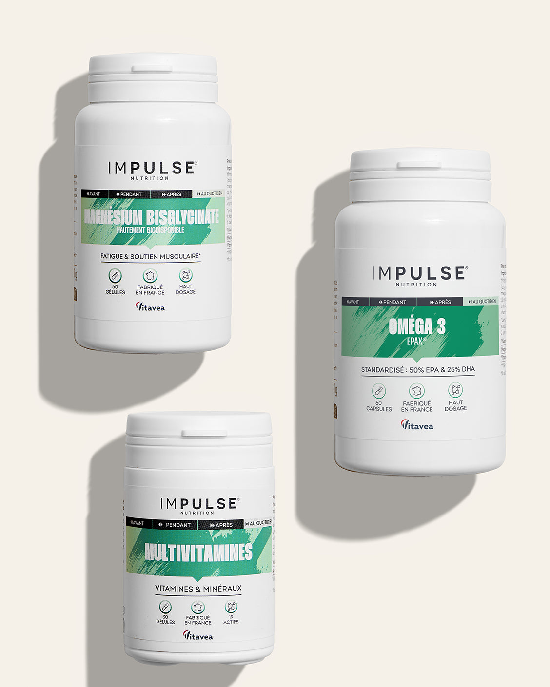Le trio incontournable au quotidien : Multivitamines enrichies en vitamines & minéraux, Oméga 3 pour un soutien cardiovasculaire et cérébral, Magnésium Bisglycinate pour lutter contre la fatigue physique et mentale. Fabrication française.