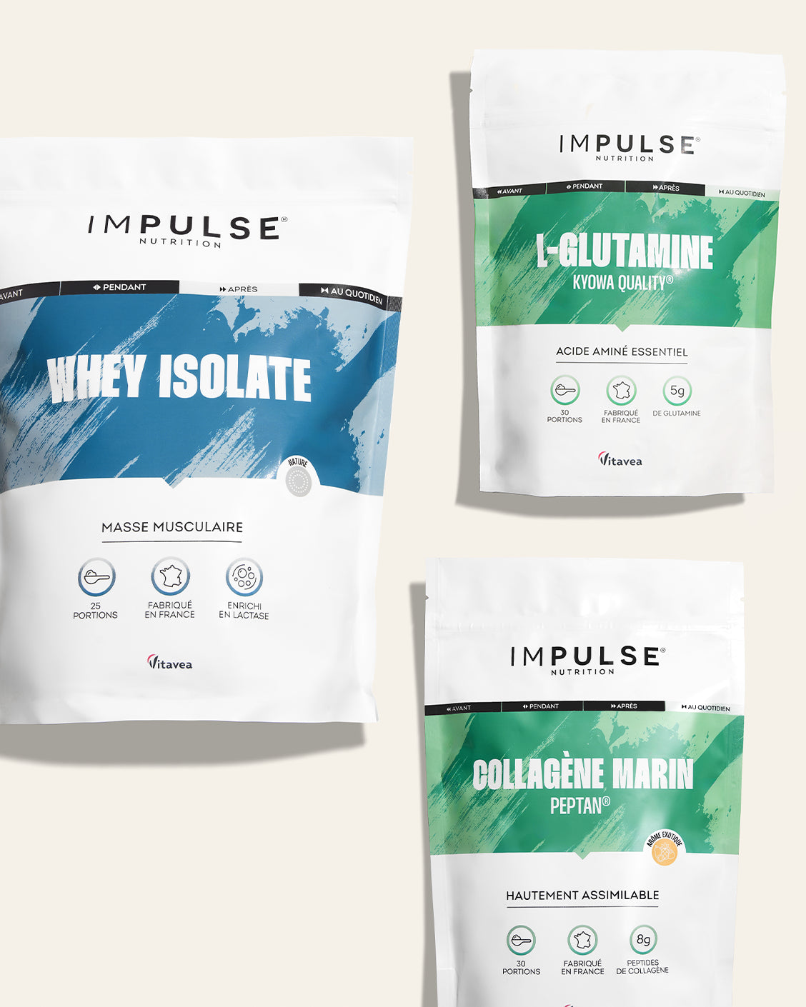 Après l’effort, offrez-vous une récupération complète avec ce combo : whey recovery pour la reconstruction musculaire, L Glutamine Kyowa® pour le confort intestinal, et les peptides de collagène Peptan® à faible poids moléculaire pour les cartilages et les tissus.